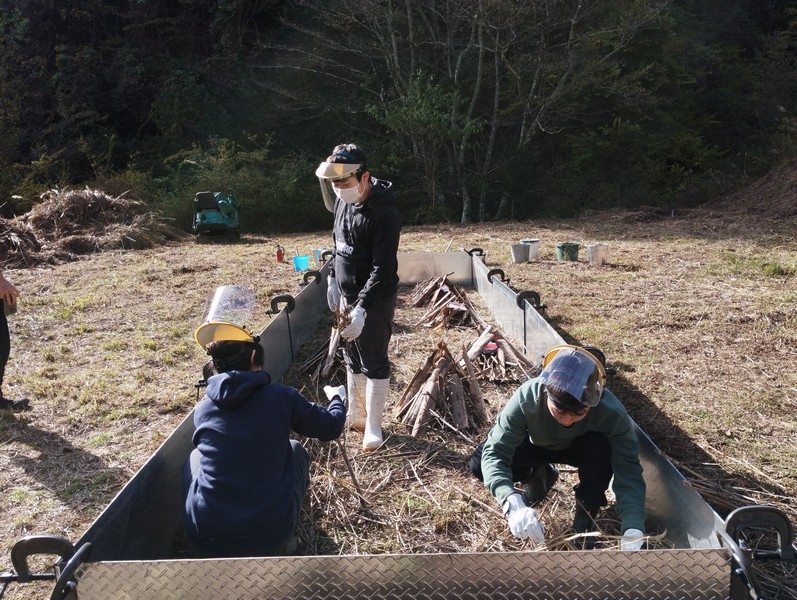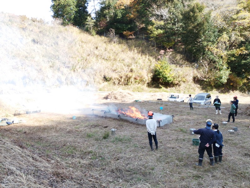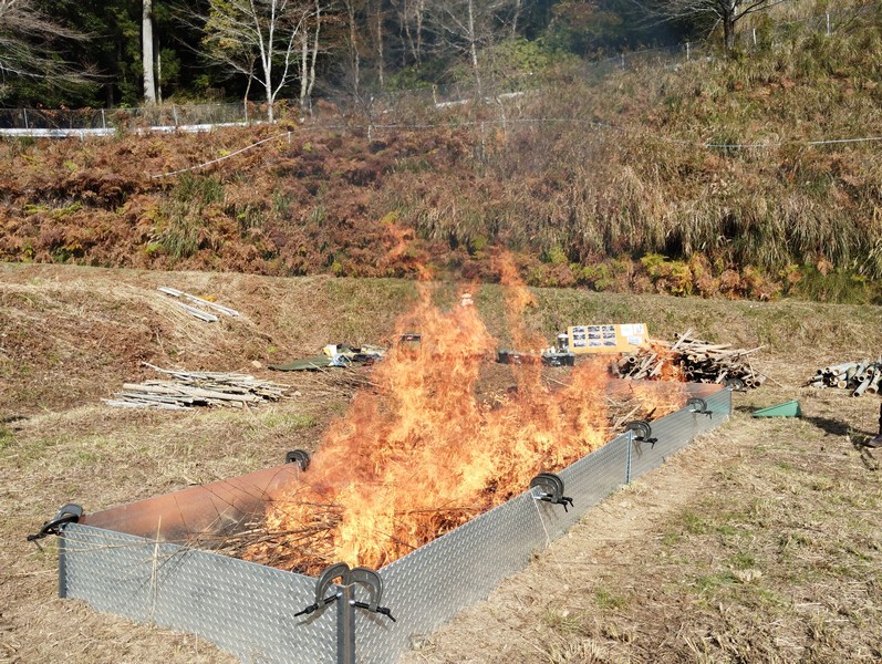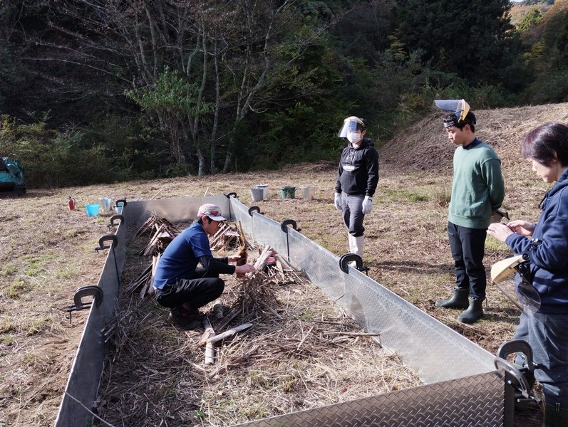 千葉県いすみ市で視察してきた炭焼きの技術を、初めて実践しました。会場はいつもの修善寺の里山から車で15分ほどの場所にある、お借りしている休耕田です。