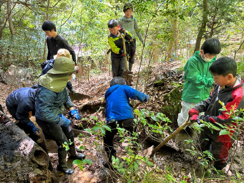 月に一度の月例整備活動では、沢の流路整備や法面の改善などを、参加者と一緒に手を動かしながら進めます。体力や経験は問いません。里山に関わりたい方、ぜひ一緒に汗をかきましょう。